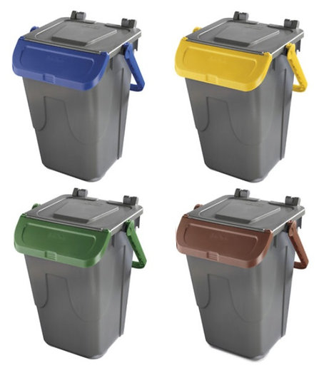 Descrizione: Kit comprendente n°4 Bidoni con sportello”a becco” in “Plastica Seconda Vita”. Polipropilene (Plastica Seconda Vita) riciclabile al 100%; resistente agli agenti atmosferici, chimici ai raggi UV; capacità: 35 L; sportello basculante a becco e coperchio con meccanismo antirandagismo; coperchio con cerniere rinforzate per una apertura a 270°; comodo maniglione ergonomico con blocco verticale; impilabile, inseribile, con presa sul fondo per un facile svuotamento; coperchi di colore giallo, verde, blu e marrone.