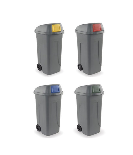 Descrizione: polipropilene (Plastica Seconda Vita) riciclabile al 100%; capacità: 100 L ; resistente agli agenti atmosferici e chimici; due ruote e un coperchio a campana con apertura basculante; maniglia di trasporto ergonomica posteriore integrata e 4 ganci fissi fermasacco; ideale per la raccolta differenziata.