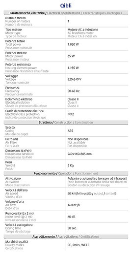 Qibli è un tradizionale asciugamano ad aria calda, dall’estetica semplice ma raffinata. Particolarmente indicato in contesti a medio-bassa affluenza, questo dryer offre un’asciugatura efficace in circa 50 secondi. Disponibile in tre diverse finiture e due tipi d’attivazione, è il giusto compromesso per chi desidera installare un prodotto affidabile e silenzioso ad un ottimo rapporto qualità-prezzo. AFFIDABILE – La tecnologia ad induzione, oltre ad estendere il periodo d’esercizio del dryer, consente di minimizzare gli interventi di manutenzione periodica, dato che il motore non dispone di elementi consumabili da sostituire nel tempo. ARIA CALDA ISTANTANEA – All’interno del dryer è installata una resistenza elettrica che riscalda istantaneamente il flusso d’asciugatura non appena la macchina viene messa in funzione. DUE TIPI DI ATTIVAZIONE – Qibli è proposto con attivazione automatica a sensore infrarossi o con attivazione manuale tramite pulsante. In quest’ultimo caso, il dryer include un timer che regola il tempo d’asciugatura tra 30 secondi e 3 minuti. MINIMO INGOMBRO – Le dimensioni compatte di Qibli ne rendono l’installazione particolarmente flessibile, soprattutto in bagni di piccole dimensioni. Grazie al suo design minimal, il dyer può essere anche posto sopra lavabo. SILENZIOSO – Con un volume d’aria di 45 l/s emesso ad una velocità massima di 80 km/h, questo dryer offre un’asciugatura efficace ma soprattutto silenziosa, dati i soli 60 dB emessi. |