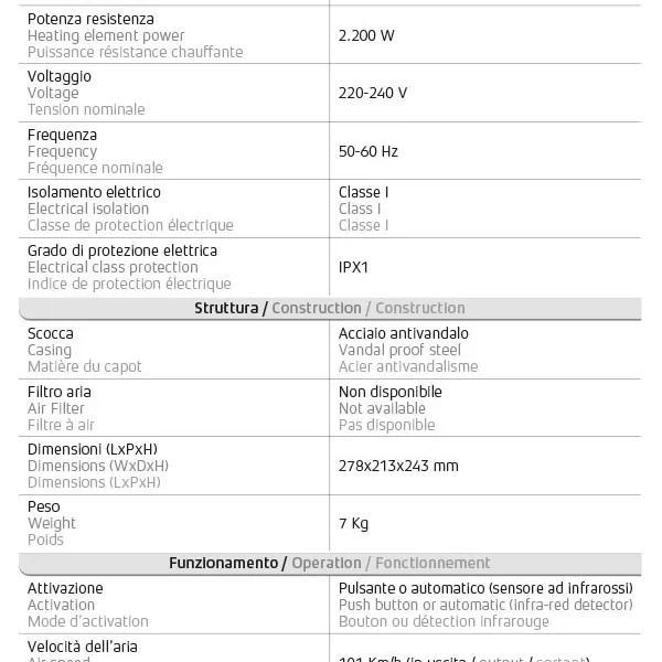 Tra gli asciugamani tradizionali, Hamet è senza dubbio il modello più conosciuto e richiesto. Un vero e proprio punto di riferimento in termini di prestazioni, affidabilità e sicurezza. Dotato di un potente motore a spazzola con resistenza elettrica da 2.400 W, questo prodotto garantisce un’efficace e rapida asciugatura delle mani. Una soluzione ideale per centri commerciali, ricreativi ed aree di servizio. PRATICO E FUNZIONALE – Propone uno stile d’asciugatura convenzionale, grazie all’ampio bocchettone girevole a 360° facilmente accessibile da qualunque utente, ivi inclusi anziani o persone con ridotte capacità motorie. ARIA CALDA ISTANTANEA – La resistenza elettrica incorporata nel dryer intiepidisce istantaneamente il flusso d’aria impiegato durante il ciclo d’asciugatura, rendendone più confortevole l’utilizzo. DUE TIPI DI ATTIVAZIONE – È disponibile nella versione manuale, con accensione a pulsante, o nella versione a sensore infrarossi, che attiva il dryer automaticamente quando rileva la presenza delle mani sotto il vano d’asciugatura. TIMER REGOLABILE – Nella versione a pulsante, Hamet include anche un timer per regolare manualmente il tempo d’asciugatura con un intervallo che può estendersi da 30 secondi a 3 minuti. ANTIVANDALISMO – Le cover in acciaio sono ideali in ambienti a rischio vandalismo poiché progettate per resistere ai tentativi di furto e alle manomissioni operate da eventuali malintenzionati. |