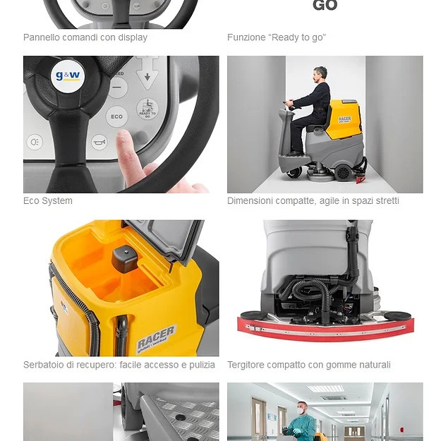 Racer R 85 FD 65 è la lavasciuga uomo a bordo ideale per l’utilizzo in aree di medie dimensioni. Compatta ed estremamente manovrabile, Racer è in grado di muoversi senza problemi anche negli spazi più stretti e congestionati, come ad esempio corridoi e casse di supermercato, evitando gli ostacoli in modo rapido ed efficace. 85 litri di capacità e una pista di lavaggio da 650 mm assicurano le migliori performance di pulizia. La bassa rumorosità, inoltre, permette a Racer di essere perfetta per il day cleaning in ambienti “sensibili” (ospedali, case di riposo, scuole). Grazie all’extra pressione a terra (facilmente attivabile dal pannello comandi) Racer è in grado di fronteggiare qualsiasi tipo di sporco; la testata retrattile, capace di adattarsi perfettamente ad ogni ostacolo, rende Racer impareggiabile nella pulizia a “filo muro”. Il gruppo tergitore in alluminio, con gomme naturali in dotazione standard, garantisce i migliori risultati di asciugatura su ogni tipo di superficie e, in caso di urti accidentali, è in grado di spostarsi e rientrare automaticamente sotto la struttura della macchina garantendo la massima sicurezza e facilità d’azione. Il pannello comandi pratico e intuitivo permette il controllo e la gestione di tutte le funzioni della macchina: - è possibile attivare la funzione READY TO GO che consente, premendo un unico tasto, l’attivazione e la regolazione di tutte le principali funzioni della macchina permettendole di essere immediatamente pronta per la sessione di lavoro; - il programma ECO SYSTEM riduce i consumi ed elimina gli sprechi mantenendo le migliori performance di pulizia nel massimo rispetto dell’ambiente. Racer è di facile utilizzo, non è richiesto alcun training ed anche le operazioni di manutenzione giornaliera sono semplici e veloci: requisiti indispensabili che permettono di utilizzare questa lavasciuga professionale anche agli operatori meno esperti. Disponibile in tre versioni, una base e due full package (BC e BC PLUS), con batterie e caricabatterie inclusi, Racer è in grado di raggiungere 4 ore di autonomia nella versione BC PLUS!