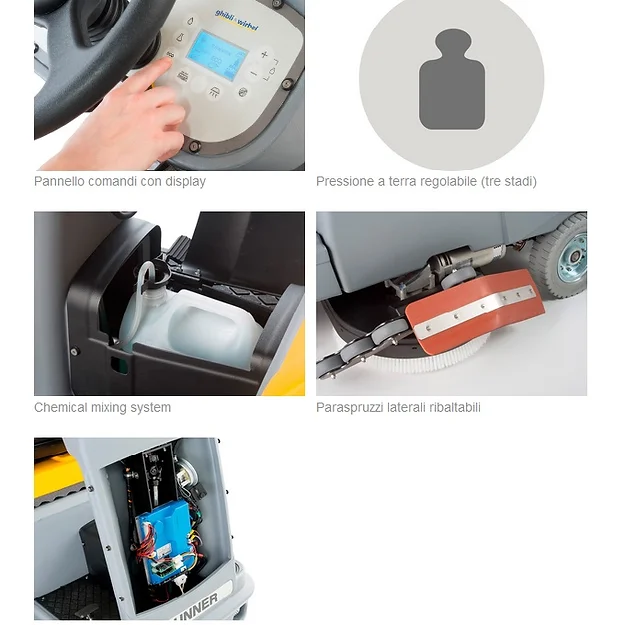 prestazioni di alto livello senza rinunciare al comfort. L’ampia pista di lavaggio (850 mm) abbinata ad una produttività di circa 5000 m²/h, garantisce la soluzione perfetta per la pulizia di grandi aree. Risultati di pulizia eccellenti grazie alla pressione a terra regolabile (tre livelli fino a 89 kg di pressione massima) e all’azione del detergente (chemical mixing system); il tergitore ampio e “reattivo” assicura risultati di asciugatura al top su ogni tipo di superficie. Runner è stata progettata per assicurare all’operatore il massimo in termini di efficienza e comfort: tutte le principali funzioni della macchina sono gestibili comodamente dal pratico ed intuitivo pannello comandi; la facile accessibilità alla macchina, unita all’ottima visibilità, assicura comodità e praticità anche per sessioni di lavoro particolarmente lunghe e faticose. La versione BC dispone di batterie (36V) e caricabatteria.
