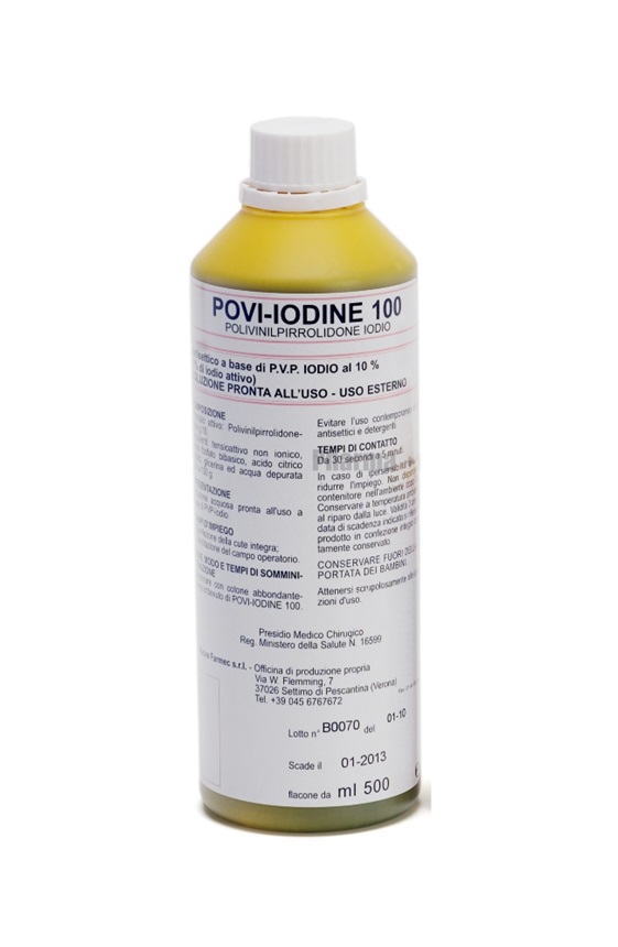 Dettagli: Antisettico- antibatterico da utilizzarsi nei seguenti casi: preparazione del campo operatorio, disinfezione della cute prima della terapia iniettiva, impiego come antisettico-microbiocida negli ambulatori medici.